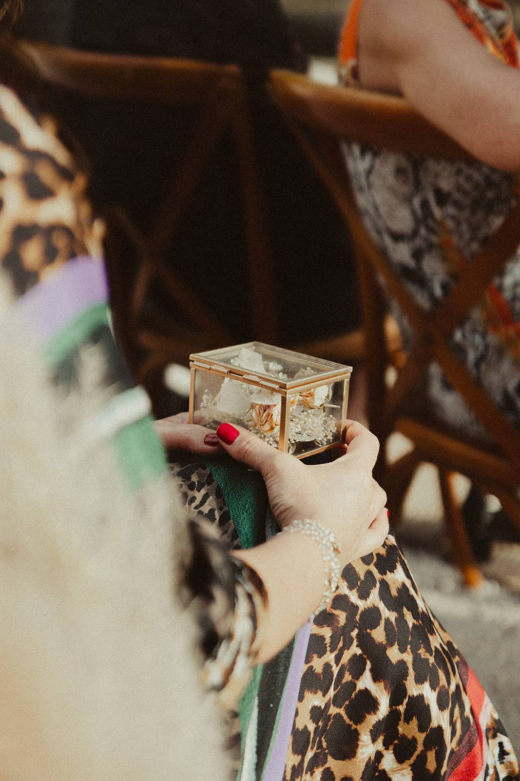 Ne négligez pas l'aspect visuel de l'échange des alliances! C'est un temps fort de votre cérémonie laïque. Votre photographe immortalisera sans doute ce moment, alors pour un maximum d'originalité, optez pour une jolie boîte: cela peut être un petit coffret de famille, un support dans le thème de votre mariage, un coquillage etc.