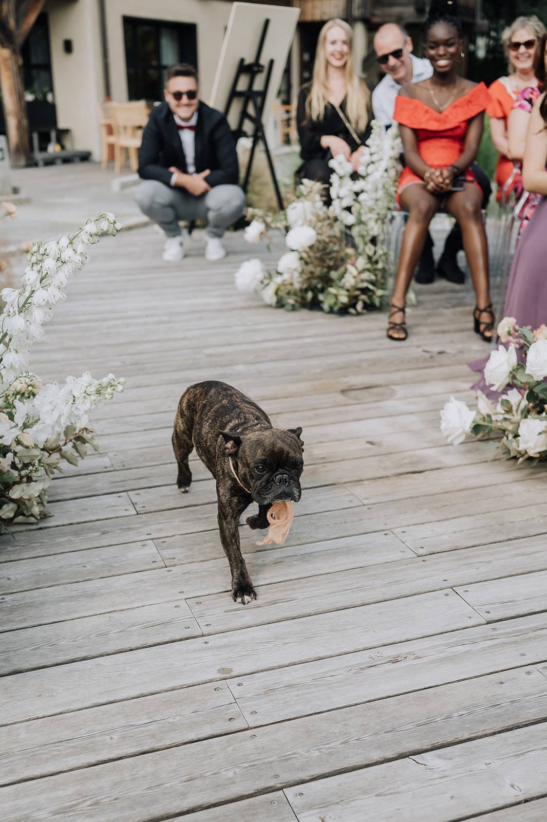 • de votre animal de compagnie: et oui, émotion garantie! Mais attention, il faut que vous puissiez avoir confiance à 2 000% en votre chien! Un bon entraînement s'impose pour cet échange d'alliances original. Vous devrez aussi pouvoir compter sur quelqu'un qui pourra vous aider le jour J à donner le départ à votre compagnon à 4 pattes, et à le récupérer une fois les alliances apportées!